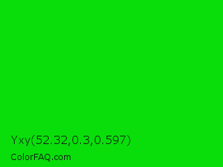 Yxy 52.32,0.3,0.597 Color is a normal green color and the nearest color is Green #00ff00. Hex code #09de0b and RGB value is rgb(9,222,11). In RGB color space, this color is composed of 4% red, 87% green, 4% blue, In CMYK color space, this color is composed of 96% cyan, 0% magenta, 95% yellow , 13% black , In HSL color space, this color has a hue angle of 121° , 92% saturation and 45% lightness.