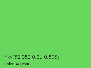 Yxy 52.352,0.31,0.506 Color is a light green color and the nearest color is Mantis #74c365. Hex code #68d75e and RGB value is rgb(104,215,94). In RGB color space, this color is composed of 41% red, 84% green, 37% blue, In CMYK color space, this color is composed of 52% cyan, 0% magenta, 56% yellow , 16% black , In HSL color space, this color has a hue angle of 115° , 60% saturation and 61% lightness.