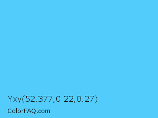Yxy 52.377,0.22,0.27 Color is a light blue color and the nearest color is Maya Blue #73c2fb. Hex code #52cdfb and RGB value is rgb(82,205,251). In RGB color space, this color is composed of 32% red, 80% green, 98% blue, In CMYK color space, this color is composed of 67% cyan, 18% magenta, 0% yellow , 2% black , In HSL color space, this color has a hue angle of 196° , 95% saturation and 65% lightness.