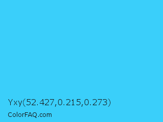 Yxy 52.427,0.215,0.273 Color is a normal cyan color and the nearest color is Picton Blue #45b1e8. Hex code #3acffa and RGB value is rgb(58,207,250). In RGB color space, this color is composed of 23% red, 81% green, 98% blue, In CMYK color space, this color is composed of 77% cyan, 17% magenta, 0% yellow , 2% black , In HSL color space, this color has a hue angle of 193° , 95% saturation and 60% lightness.