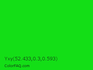 Yxy 52.433,0.3,0.593 Color is a normal green color and the nearest color is Vivid Malachite #00cc33. Hex code #13de16 and RGB value is rgb(19,222,22). In RGB color space, this color is composed of 7% red, 87% green, 9% blue, In CMYK color space, this color is composed of 91% cyan, 0% magenta, 90% yellow , 13% black , In HSL color space, this color has a hue angle of 121° , 84% saturation and 47% lightness.