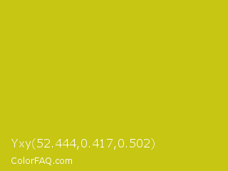 Yxy 52.444,0.417,0.502 Color is a normal yellow color and the nearest color is Key Lime Pie #bfc921. Hex code #c6c613 and RGB value is rgb(198,198,19). In RGB color space, this color is composed of 78% red, 78% green, 7% blue, In CMYK color space, this color is composed of 0% cyan, 0% magenta, 90% yellow , 22% black , In HSL color space, this color has a hue angle of 60° , 82% saturation and 43% lightness.