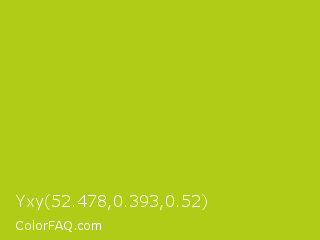 Yxy 52.478,0.393,0.52 Color is a normal yellow color and the nearest color is La Rioja #b3c110. Hex code #b0cc16 and RGB value is rgb(176,204,22). In RGB color space, this color is composed of 69% red, 80% green, 9% blue, In CMYK color space, this color is composed of 14% cyan, 0% magenta, 89% yellow , 20% black , In HSL color space, this color has a hue angle of 69° , 81% saturation and 44% lightness.
