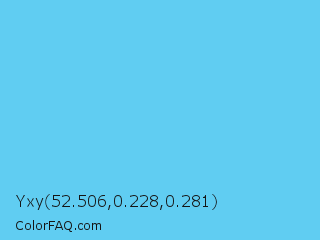 Yxy 52.506,0.228,0.281 Color is a light blue color and the nearest color is Turquoise Blue #6cdae7. Hex code #60cdf2 and RGB value is rgb(96,205,242). In RGB color space, this color is composed of 38% red, 80% green, 95% blue, In CMYK color space, this color is composed of 60% cyan, 15% magenta, 0% yellow , 5% black , In HSL color space, this color has a hue angle of 195° , 85% saturation and 66% lightness.