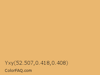 Yxy 52.507,0.418,0.408 Color is a light orange color and the nearest color is Middle Yellow Red #ecb176. Hex code #eab76f and RGB value is rgb(234,183,111). In RGB color space, this color is composed of 92% red, 72% green, 44% blue, In CMYK color space, this color is composed of 0% cyan, 22% magenta, 53% yellow , 8% black , In HSL color space, this color has a hue angle of 35° , 75% saturation and 68% lightness.