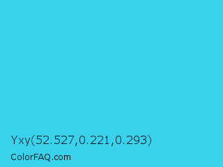 Yxy 52.527,0.221,0.293 Color is a normal cyan color and the nearest color is Scooter #2ebfd4. Hex code #3ad1ec and RGB value is rgb(58,209,236). In RGB color space, this color is composed of 23% red, 82% green, 93% blue, In CMYK color space, this color is composed of 75% cyan, 11% magenta, 0% yellow , 7% black , In HSL color space, this color has a hue angle of 189° , 82% saturation and 58% lightness.
