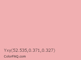 Yxy 52.535,0.371,0.327 Color is a very light red color and the nearest color is Shilo #e8b9b3. Hex code #f1afb1 and RGB value is rgb(241,175,177). In RGB color space, this color is composed of 95% red, 69% green, 69% blue, In CMYK color space, this color is composed of 0% cyan, 27% magenta, 27% yellow , 5% black , In HSL color space, this color has a hue angle of 358° , 70% saturation and 82% lightness.