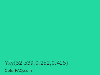Yxy 52.539,0.252,0.415 Color is a normal green color and the nearest color is Shamrock #33cc99. Hex code #22d9a1 and RGB value is rgb(34,217,161). In RGB color space, this color is composed of 13% red, 85% green, 63% blue, In CMYK color space, this color is composed of 84% cyan, 0% magenta, 26% yellow , 15% black , In HSL color space, this color has a hue angle of 162° , 73% saturation and 49% lightness.