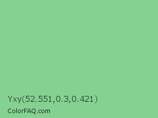 Yxy 52.551,0.3,0.421 Color is a light green color and the nearest color is De York #7ac488. Hex code #84d191 and RGB value is rgb(132,209,145). In RGB color space, this color is composed of 52% red, 82% green, 57% blue, In CMYK color space, this color is composed of 37% cyan, 0% magenta, 31% yellow , 18% black , In HSL color space, this color has a hue angle of 130° , 46% saturation and 67% lightness.