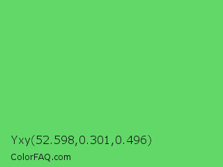 Yxy 52.598,0.301,0.496 Color is a light green color and the nearest color is Pastel Green #77dd77. Hex code #61d868 and RGB value is rgb(97,216,104). In RGB color space, this color is composed of 38% red, 85% green, 41% blue, In CMYK color space, this color is composed of 55% cyan, 0% magenta, 52% yellow , 15% black , In HSL color space, this color has a hue angle of 124° , 60% saturation and 61% lightness.