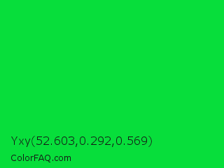 Yxy 52.603,0.292,0.569 Color is a normal green color and the nearest color is Vivid Malachite #00cc33. Hex code #07de3b and RGB value is rgb(7,222,59). In RGB color space, this color is composed of 3% red, 87% green, 23% blue, In CMYK color space, this color is composed of 97% cyan, 0% magenta, 73% yellow , 13% black , In HSL color space, this color has a hue angle of 135° , 94% saturation and 45% lightness.