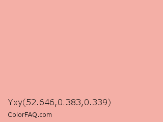 Yxy 52.646,0.383,0.339 Color is a light red color and the nearest color is Rose Bud #fbb2a3. Hex code #f4afa6 and RGB value is rgb(244,175,166). In RGB color space, this color is composed of 96% red, 69% green, 65% blue, In CMYK color space, this color is composed of 0% cyan, 28% magenta, 32% yellow , 4% black , In HSL color space, this color has a hue angle of 7° , 78% saturation and 80% lightness.