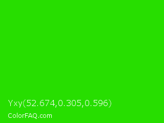 Yxy 52.674,0.305,0.596 Color is a normal green color and the nearest color is Harlequin #3fff00. Hex code #27de00 and RGB value is rgb(39,222,0). In RGB color space, this color is composed of 15% red, 87% green, 0% blue, In CMYK color space, this color is composed of 82% cyan, 0% magenta, 100% yellow , 13% black , In HSL color space, this color has a hue angle of 109° , 100% saturation and 44% lightness.