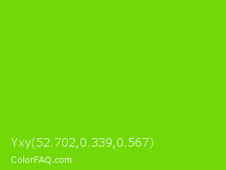 Yxy 52.702,0.339,0.567 Color is a normal green color and the nearest color is Alien Armpit #84de02. Hex code #72d808 and RGB value is rgb(114,216,8). In RGB color space, this color is composed of 45% red, 85% green, 3% blue, In CMYK color space, this color is composed of 47% cyan, 0% magenta, 96% yellow , 15% black , In HSL color space, this color has a hue angle of 89° , 93% saturation and 44% lightness.