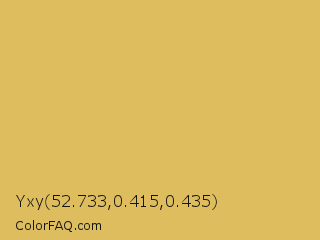 Yxy 52.733,0.415,0.435 Color is a light orange color and the nearest color is Equator #e1bc64. Hex code #debd5e and RGB value is rgb(222,189,94). In RGB color space, this color is composed of 87% red, 74% green, 37% blue, In CMYK color space, this color is composed of 0% cyan, 15% magenta, 58% yellow , 13% black , In HSL color space, this color has a hue angle of 45° , 66% saturation and 62% lightness.