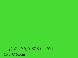 Yxy 52.736,0.308,0.565 Color is a normal green color and the nearest color is Lime Green #32cd32. Hex code #46dc34 and RGB value is rgb(70,220,52). In RGB color space, this color is composed of 27% red, 86% green, 20% blue, In CMYK color space, this color is composed of 68% cyan, 0% magenta, 76% yellow , 14% black , In HSL color space, this color has a hue angle of 114° , 71% saturation and 53% lightness.