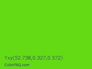 Yxy 52.738,0.327,0.572 Color is a normal green color and the nearest color is Harlequin Green #46cb18. Hex code #61da15 and RGB value is rgb(97,218,21). In RGB color space, this color is composed of 38% red, 85% green, 8% blue, In CMYK color space, this color is composed of 56% cyan, 0% magenta, 90% yellow , 15% black , In HSL color space, this color has a hue angle of 97° , 82% saturation and 47% lightness.