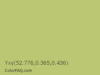 Yxy 52.776,0.365,0.436 Color is a light yellow color and the nearest color is Wild Willow #b9c46a. Hex code #bcc773 and RGB value is rgb(188,199,115). In RGB color space, this color is composed of 74% red, 78% green, 45% blue, In CMYK color space, this color is composed of 6% cyan, 0% magenta, 42% yellow , 22% black , In HSL color space, this color has a hue angle of 68° , 43% saturation and 62% lightness.
