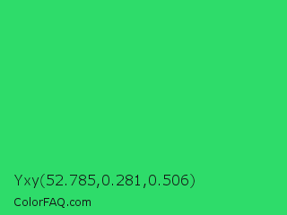 Yxy 52.785,0.281,0.506 Color is a normal green color and the nearest color is UFO Green #3cd070. Hex code #2edc6a and RGB value is rgb(46,220,106). In RGB color space, this color is composed of 18% red, 86% green, 42% blue, In CMYK color space, this color is composed of 79% cyan, 0% magenta, 52% yellow , 14% black , In HSL color space, this color has a hue angle of 141° , 71% saturation and 52% lightness.