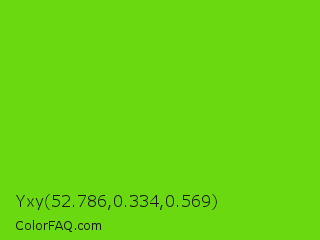 Yxy 52.786,0.334,0.569 Color is a normal green color and the nearest color is Alien Armpit #84de02. Hex code #6bd90f and RGB value is rgb(107,217,15). In RGB color space, this color is composed of 42% red, 85% green, 6% blue, In CMYK color space, this color is composed of 51% cyan, 0% magenta, 93% yellow , 15% black , In HSL color space, this color has a hue angle of 93° , 87% saturation and 45% lightness.
