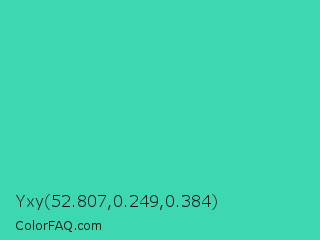 Yxy 52.807,0.249,0.384 Color is a normal cyan color and the nearest color is Eucalyptus #44d7a8. Hex code #3dd7b2 and RGB value is rgb(61,215,178). In RGB color space, this color is composed of 24% red, 84% green, 70% blue, In CMYK color space, this color is composed of 72% cyan, 0% magenta, 17% yellow , 16% black , In HSL color space, this color has a hue angle of 166° , 66% saturation and 54% lightness.