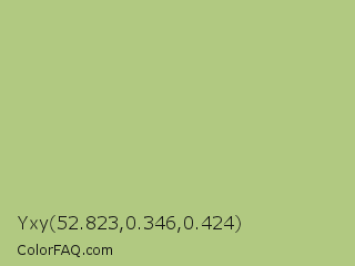 Yxy 52.823,0.346,0.424 Color is a light green color and the nearest color is Sage #bcb88a. Hex code #b1c981 and RGB value is rgb(177,201,129). In RGB color space, this color is composed of 69% red, 79% green, 51% blue, In CMYK color space, this color is composed of 12% cyan, 0% magenta, 36% yellow , 21% black , In HSL color space, this color has a hue angle of 80° , 40% saturation and 65% lightness.