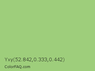 Yxy 52.842,0.333,0.442 Color is a light green color and the nearest color is Pistachio #93c572. Hex code #9ece7b and RGB value is rgb(158,206,123). In RGB color space, this color is composed of 62% red, 81% green, 48% blue, In CMYK color space, this color is composed of 23% cyan, 0% magenta, 40% yellow , 19% black , In HSL color space, this color has a hue angle of 95° , 46% saturation and 65% lightness.