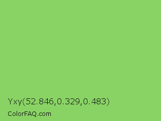 Yxy 52.846,0.329,0.483 Color is a light green color and the nearest color is Pistachio #93c572. Hex code #89d365 and RGB value is rgb(137,211,101). In RGB color space, this color is composed of 54% red, 83% green, 40% blue, In CMYK color space, this color is composed of 35% cyan, 0% magenta, 52% yellow , 17% black , In HSL color space, this color has a hue angle of 100° , 56% saturation and 61% lightness.