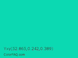 Yxy 52.865,0.242,0.389 Color is a normal cyan color and the nearest color is Amazonite #00c4b0. Hex code #0ad9b1 and RGB value is rgb(10,217,177). In RGB color space, this color is composed of 4% red, 85% green, 69% blue, In CMYK color space, this color is composed of 95% cyan, 0% magenta, 18% yellow , 15% black , In HSL color space, this color has a hue angle of 168° , 91% saturation and 45% lightness.