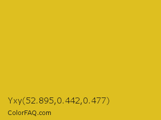 Yxy 52.895,0.442,0.477 Color is a normal yellow color and the nearest color is Gold Tips #deba13. Hex code #debf20 and RGB value is rgb(222,191,32). In RGB color space, this color is composed of 87% red, 75% green, 13% blue, In CMYK color space, this color is composed of 0% cyan, 14% magenta, 86% yellow , 13% black , In HSL color space, this color has a hue angle of 50° , 75% saturation and 50% lightness.