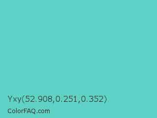 Yxy 52.908,0.251,0.352 Color is a normal cyan color and the nearest color is Downy #6fd0c5. Hex code #5ed3c3 and RGB value is rgb(94,211,195). In RGB color space, this color is composed of 37% red, 83% green, 76% blue, In CMYK color space, this color is composed of 55% cyan, 0% magenta, 8% yellow , 17% black , In HSL color space, this color has a hue angle of 172° , 57% saturation and 60% lightness.