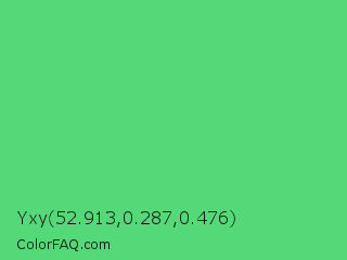 Yxy 52.913,0.287,0.476 Color is a normal green color and the nearest color is Emerald #50c878. Hex code #54d978 and RGB value is rgb(84,217,120). In RGB color space, this color is composed of 33% red, 85% green, 47% blue, In CMYK color space, this color is composed of 61% cyan, 0% magenta, 45% yellow , 15% black , In HSL color space, this color has a hue angle of 136° , 64% saturation and 59% lightness.