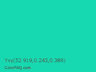 Yxy 52.919,0.243,0.389 Color is a normal cyan color and the nearest color is Java #1fc2c2. Hex code #16d9b1 and RGB value is rgb(22,217,177). In RGB color space, this color is composed of 9% red, 85% green, 69% blue, In CMYK color space, this color is composed of 90% cyan, 0% magenta, 18% yellow , 15% black , In HSL color space, this color has a hue angle of 168° , 82% saturation and 47% lightness.