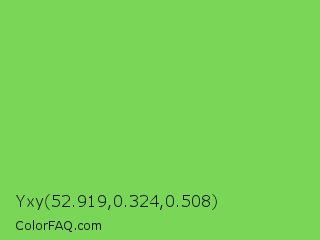 Yxy 52.919,0.324,0.508 Color is a normal green color and the nearest color is Mantis #74c365. Hex code #7ad657 and RGB value is rgb(122,214,87). In RGB color space, this color is composed of 48% red, 84% green, 34% blue, In CMYK color space, this color is composed of 43% cyan, 0% magenta, 59% yellow , 16% black , In HSL color space, this color has a hue angle of 103° , 61% saturation and 59% lightness.