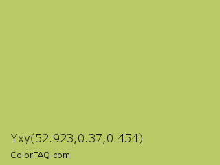 Yxy 52.923,0.37,0.454 Color is a normal yellow color and the nearest color is Wild Willow #b9c46a. Hex code #b8c966 and RGB value is rgb(184,201,102). In RGB color space, this color is composed of 72% red, 79% green, 40% blue, In CMYK color space, this color is composed of 8% cyan, 0% magenta, 49% yellow , 21% black , In HSL color space, this color has a hue angle of 70° , 48% saturation and 59% lightness.