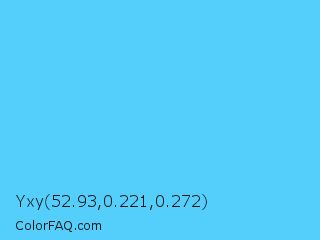 Yxy 52.93,0.221,0.272 Color is a light blue color and the nearest color is Turquoise Blue #6cdae7. Hex code #54cefa and RGB value is rgb(84,206,250). In RGB color space, this color is composed of 33% red, 81% green, 98% blue, In CMYK color space, this color is composed of 66% cyan, 18% magenta, 0% yellow , 2% black , In HSL color space, this color has a hue angle of 196° , 94% saturation and 65% lightness.
