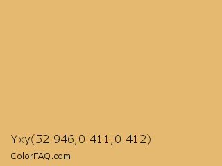 Yxy 52.946,0.411,0.412 Color is a light orange color and the nearest color is Harvest Gold #e0b974. Hex code #e5ba70 and RGB value is rgb(229,186,112). In RGB color space, this color is composed of 90% red, 73% green, 44% blue, In CMYK color space, this color is composed of 0% cyan, 19% magenta, 51% yellow , 10% black , In HSL color space, this color has a hue angle of 38° , 69% saturation and 67% lightness.