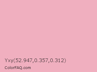 Yxy 52.947,0.357,0.312 Color is a very light red color and the nearest color is Nadeshiko Pink #f6adc6. Hex code #f0afbf and RGB value is rgb(240,175,191). In RGB color space, this color is composed of 94% red, 69% green, 75% blue, In CMYK color space, this color is composed of 0% cyan, 27% magenta, 20% yellow , 6% black , In HSL color space, this color has a hue angle of 345° , 68% saturation and 81% lightness.