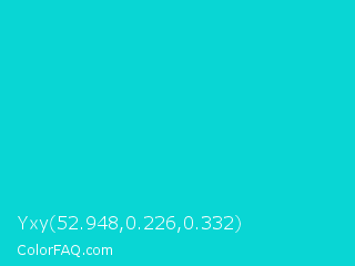 Yxy 52.948,0.226,0.332 Color is a normal cyan color and the nearest color is Dark Turquoise #00ced1. Hex code #09d6d4 and RGB value is rgb(9,214,212). In RGB color space, this color is composed of 4% red, 84% green, 83% blue, In CMYK color space, this color is composed of 96% cyan, 0% magenta, 1% yellow , 16% black , In HSL color space, this color has a hue angle of 179° , 92% saturation and 44% lightness.