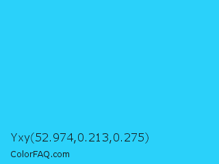 Yxy 52.974,0.213,0.275 Color is a normal cyan color and the nearest color is Spiro Disco Ball #0fc0fc. Hex code #2ad1fa and RGB value is rgb(42,209,250). In RGB color space, this color is composed of 16% red, 82% green, 98% blue, In CMYK color space, this color is composed of 83% cyan, 16% magenta, 0% yellow , 2% black , In HSL color space, this color has a hue angle of 192° , 95% saturation and 57% lightness.