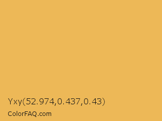 Yxy 52.974,0.437,0.43 Color is a light orange color and the nearest color is Casablanca #f8b853. Hex code #edb857 and RGB value is rgb(237,184,87). In RGB color space, this color is composed of 93% red, 72% green, 34% blue, In CMYK color space, this color is composed of 0% cyan, 22% magenta, 63% yellow , 7% black , In HSL color space, this color has a hue angle of 39° , 81% saturation and 64% lightness.