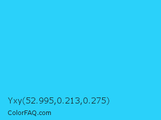 Yxy 52.995,0.213,0.275 Color is a normal cyan color and the nearest color is Spiro Disco Ball #0fc0fc. Hex code #2ad1fa and RGB value is rgb(42,209,250). In RGB color space, this color is composed of 16% red, 82% green, 98% blue, In CMYK color space, this color is composed of 83% cyan, 16% magenta, 0% yellow , 2% black , In HSL color space, this color has a hue angle of 192° , 95% saturation and 57% lightness.