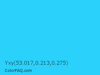 Yxy 53.017,0.213,0.275 Color is a normal cyan color and the nearest color is Spiro Disco Ball #0fc0fc. Hex code #2ad1fa and RGB value is rgb(42,209,250). In RGB color space, this color is composed of 16% red, 82% green, 98% blue, In CMYK color space, this color is composed of 83% cyan, 16% magenta, 0% yellow , 2% black , In HSL color space, this color has a hue angle of 192° , 95% saturation and 57% lightness.