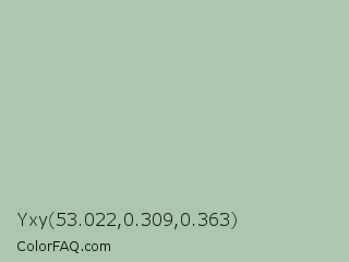 Yxy 53.022,0.309,0.363 Color is a light green color and the nearest color is Spring Rain #accbb1. Hex code #abc8ae and RGB value is rgb(171,200,174). In RGB color space, this color is composed of 67% red, 78% green, 68% blue, In CMYK color space, this color is composed of 15% cyan, 0% magenta, 13% yellow , 22% black , In HSL color space, this color has a hue angle of 126° , 21% saturation and 73% lightness.