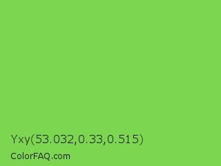 Yxy 53.032,0.33,0.515 Color is a normal green color and the nearest color is Kiwi #8ee53f. Hex code #7dd650 and RGB value is rgb(125,214,80). In RGB color space, this color is composed of 49% red, 84% green, 31% blue, In CMYK color space, this color is composed of 42% cyan, 0% magenta, 63% yellow , 16% black , In HSL color space, this color has a hue angle of 100° , 62% saturation and 58% lightness.