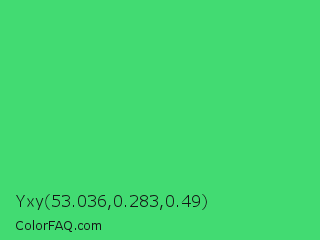 Yxy 53.036,0.283,0.49 Color is a normal green color and the nearest color is UFO Green #3cd070. Hex code #42db72 and RGB value is rgb(66,219,114). In RGB color space, this color is composed of 26% red, 86% green, 45% blue, In CMYK color space, this color is composed of 70% cyan, 0% magenta, 48% yellow , 14% black , In HSL color space, this color has a hue angle of 139° , 68% saturation and 56% lightness.