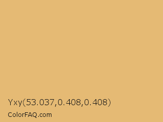 Yxy 53.037,0.408,0.408 Color is a light orange color and the nearest color is Harvest Gold #e0b974. Hex code #e5ba74 and RGB value is rgb(229,186,116). In RGB color space, this color is composed of 90% red, 73% green, 45% blue, In CMYK color space, this color is composed of 0% cyan, 19% magenta, 49% yellow , 10% black , In HSL color space, this color has a hue angle of 37° , 68% saturation and 68% lightness.