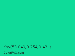 Yxy 53.049,0.254,0.431 Color is a normal green color and the nearest color is Caribbean Green #00cc99. Hex code #0edb99 and RGB value is rgb(14,219,153). In RGB color space, this color is composed of 5% red, 86% green, 60% blue, In CMYK color space, this color is composed of 94% cyan, 0% magenta, 30% yellow , 14% black , In HSL color space, this color has a hue angle of 161° , 88% saturation and 46% lightness.