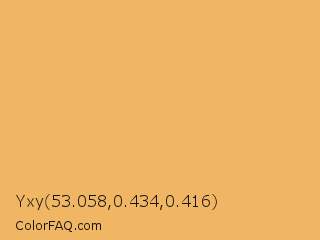 Yxy 53.058,0.434,0.416 Color is a light orange color and the nearest color is Rajah #f7b668. Hex code #f1b663 and RGB value is rgb(241,182,99). In RGB color space, this color is composed of 95% red, 71% green, 39% blue, In CMYK color space, this color is composed of 0% cyan, 24% magenta, 59% yellow , 5% black , In HSL color space, this color has a hue angle of 35° , 84% saturation and 67% lightness.