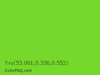 Yxy 53.061,0.336,0.552 Color is a normal green color and the nearest color is Lima #76bd17. Hex code #75d82a and RGB value is rgb(117,216,42). In RGB color space, this color is composed of 46% red, 85% green, 16% blue, In CMYK color space, this color is composed of 46% cyan, 0% magenta, 81% yellow , 15% black , In HSL color space, this color has a hue angle of 94° , 69% saturation and 51% lightness.